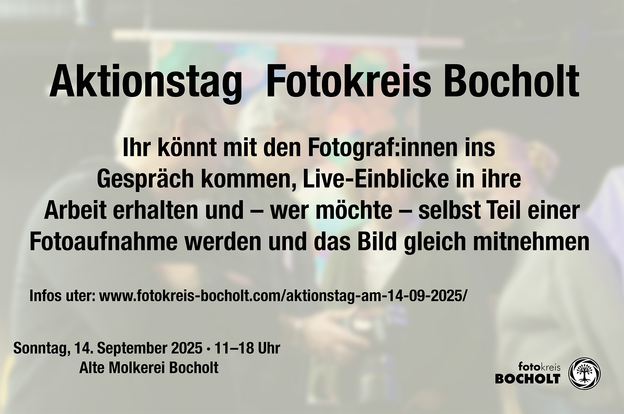 Highlight: Am 14.09. ab. 10:00 Uhr findet (ebenfalls in der Alten Molkerei) ein Aktionstag statt – mit Live-Einblicken in die Arbeit der Fotograf:innen, Fototechnik zum Anfassen und persönlichen Gesprächen rund ums Bild.